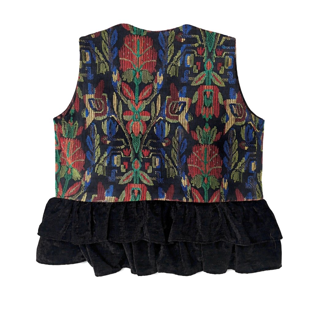 A jacquard vest with traditional patterns and velvet hem. Designed for easy layering and everyday wear.